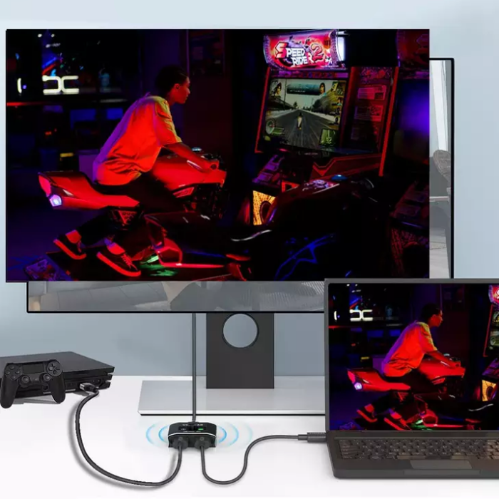 Ez a kiváló minőségű fémből készült adapter nagyon egyszerűen, megszakítás nélkül és a felbontás megváltoztatása nélkül képes 2 különböző HDMI-forrásról videót és hangot átvinni a kijelzőre.