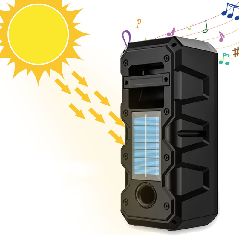 Hordozható napelemes hangszóró: A napelemes hangszóró beépített napelemes panellel érkezik, és könnyen tölthető a szabadban. Élvezze a zenét folyamatosan!