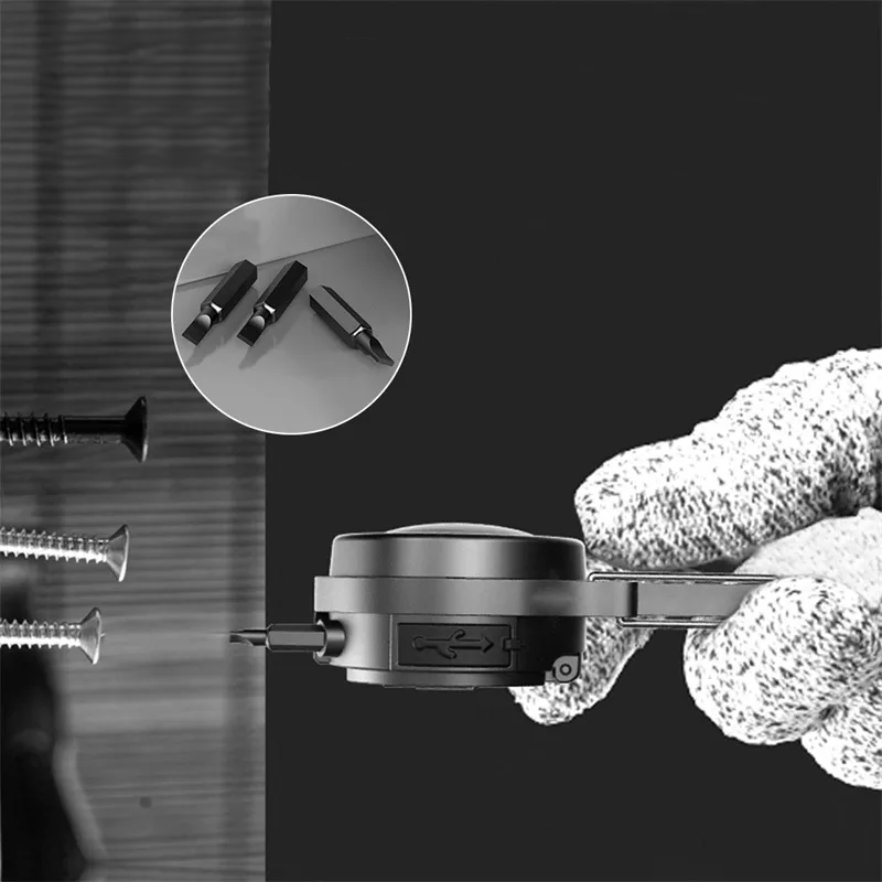 4 csavarhúzófej: A kulcstartó 4 csavarhúzófejjel rendelkezik, amelyek könnyen használhatók, amikor szüksége van rá, és egy beépített, nagy kapacitású újratölthető akkumulátorral működik.