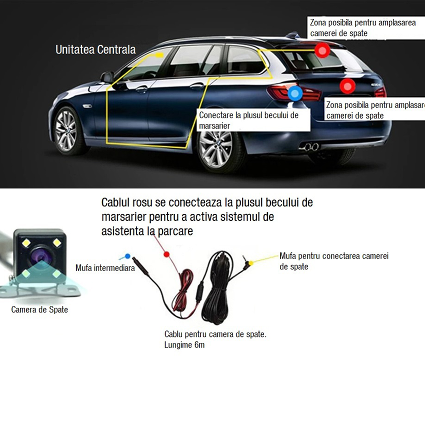 A hátsó kamera kábelének piros vezetéke táplálja a kamera LED-jeit, és csatlakozik a jármű tolatólámpájához. A fekete kábel a FullHD autótükör típusú kamerához csatlakozik.