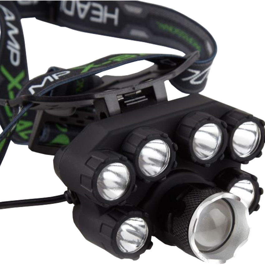 LED fejű zseblámpa 7 LED-del, 5 hideg fehér fénnyel és 2 kék fénnyel, teljesítmény 1W/LED, újratölthető elülső lámpa, zoommal, fénysugár szögállítással, 12V és 220V töltéssel;
